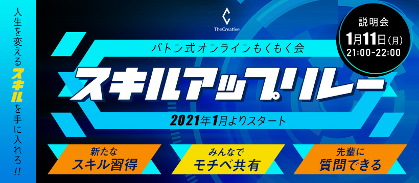 スキルアップリレー バナー CLIENT 株式会社クリエイティブユニバース様 DESCRIPTION コミュニティ内のイベント「スキルアップリレー」のバナーを制作しました。 IN CHARGE デザイン TOOL Adobe Photoshop